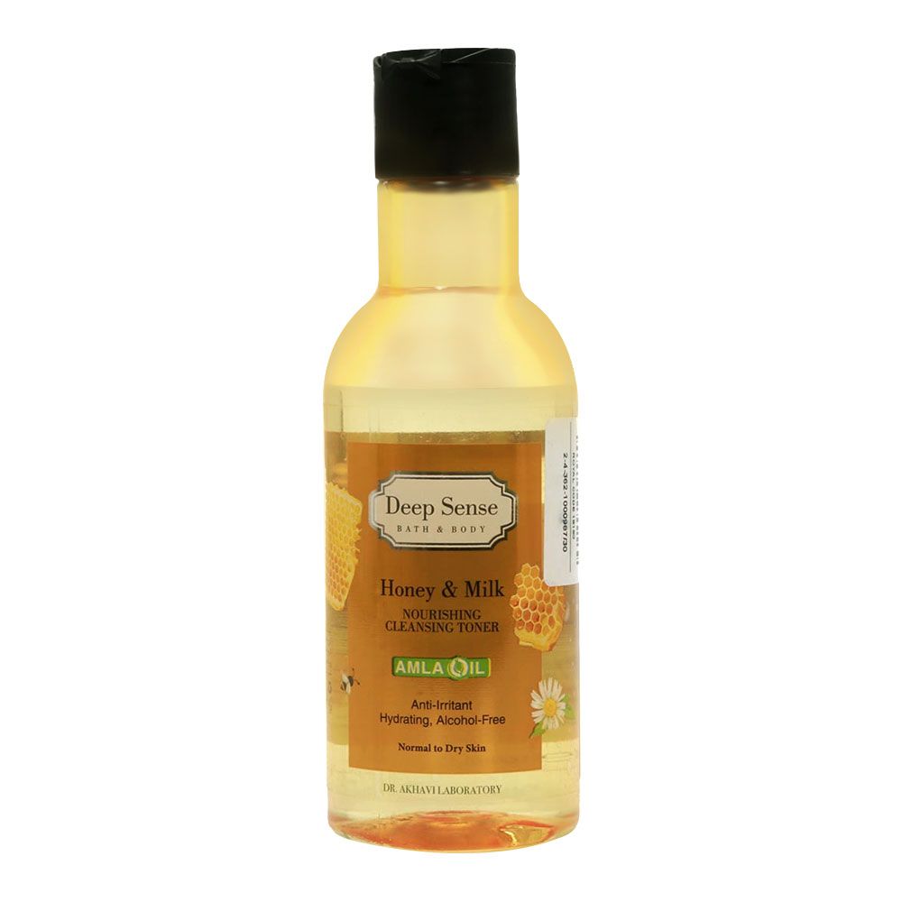 تونر پاک کننده و مرطوب کننده شیر و عسل دیپ سنس قابل استفاده برای پوست‌های خشک تا نرمال است که ضمن پاکسازی عمیق پوست از آلودگی و چربی اضافه، منافذ پوست را کوچک نموده و با تسکین التهابات سبب ایجاد حس آرامش در پوست خواهد شد. این محصول ضد التهاب و ضد حساسیت است و به آبرسانی و نرم شدن پوست صورت کمک می‌نماید. تونر دیپ سنس سبب شفاف شدن پوست صورت گردیده و تا حد زیادی در بسته شدن منافذ پوست تاثیر دارد. در ترکیبات این تونر از عصاره عسل، پروتئین هیدرولیز شده شیر و سدیم هیالورونات نیز استفاده شده است. عصاره عسل رطوبت مورد نیاز پوست را تامین کرده و به ترمیم پوست آسیب دیده کمک می‌کند.  پروتئین هیدرولیز شده شیر به عنوان یک پاک کننده طبیعی صورت عمل نموده و باعث جلوگیری از ایجاد جوش و پاکسازی منافذ بسته پوست خواهد شد. این ماده رطوبت مورد نیاز پوست را تامین می‌سازد و سبب تسکین و از بین بردن التهاب پوست می‌شود. سدیم هیالورونات به عنوان یک ماده آبرسان و رطوبت رسان، باعث افزایش آب بین سلول‌های پوست شده و به درمان خشکی و کم آبی پوست کمک می‌نماید. جهت استفاده از تونر پوست خشک تا نرمال شیر و عسل دیپ سنس توصیه می‌شود پوست را با پد آغشته به محلول به آرامی پاک نمایید.