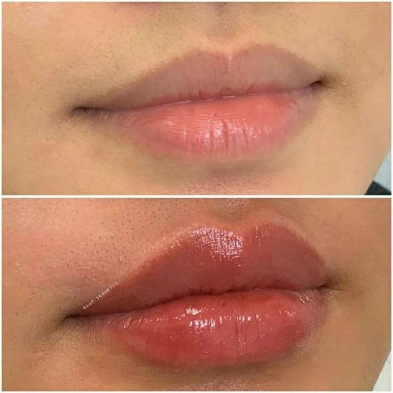 - به مقدار کافی از مایع حجم دهنده را روی لب خود بزنید.