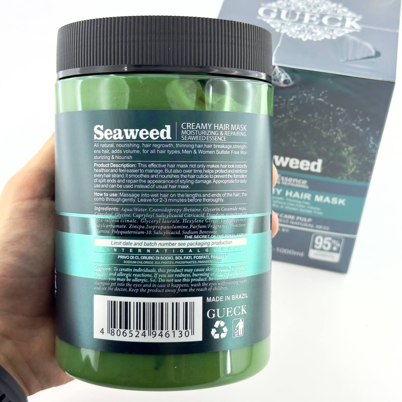 عصاره جلبک دریایی غنی از ترکیبات مغذی مثل ویتامین B5 و ویتامین E می باشد. این ویتامین ها مواد بسیار مفیدی برای موهای خشک و وز می باشد و به شدت موجب مرطوب شدن و لطیف شدن موهای شما خواهد شد. ماسک مو جلبک دریایی حاوی پروتئین هیدرولیز شده بوده که قدرت موجب مرطوب کردن و رفع خشکی موها می شود. بنابر این این ماسک مو گزینه ای مناسب برای افرادی با موی خشک و یا افرادی که میخواهند با تغذیه و مراقبت از مو، از بروز آسیب های مو در آینده جلوگیری کنند. لازم به ذکر است فرمولاسیون این ماسک مو بدون مواد مضری همچون سولفات و پارابن بوده و هیچ آسیبی به موهای شما وارد نمی کند.